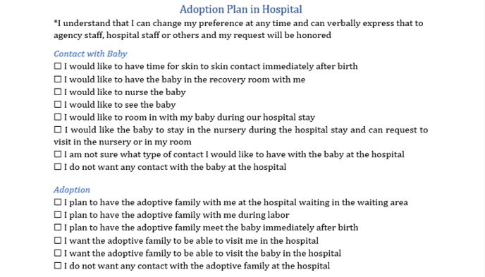 Our agency advocates for the birth parents wishes regarding contact with baby in the hospital and will be supportive of those expressed wishes, even if those expectations change while at the hospital. This period of post-labor is a sensitive and imperative time for birth parents to have what they feel is needed in order to make a decision regarding what is best for their child. Hopeful adoptive parents should not feel that changes in expectations regarding hospital contact is an indicator of a birth parent(s) changing their mind regarding their decision. It is normal for parents to grieve and waiver in their decision of adoption and they need space to do that without additional pressure.
